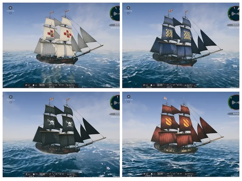 - The number of visual options for ships and sails has been expanded. Heraldry has been added for each nation and pirates. Ships with a red color are trade ships, and dark-colored ships are military. Each nation now has its heraldry, which differs for trade and military ships. This makes it easy to distinguish the modification of the ship by its appearance. Now, the game has four colors of sails: gray, white, red, and black.